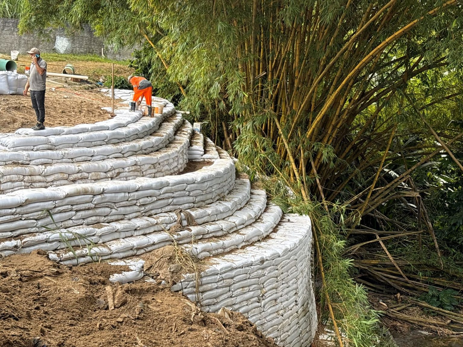 O problema foi provocado por um rompimento na rede de drenagem, que ocasionou uma erosão de aproximadamente seis metros de profundidade. As equipes atuaram com a técnica de rip-rap, utilizada para estabilizar o solo e proteger taludes, garantindo maior resistência e durabilidade à área. Ao todo, estão sendo aplicadas mais de 5 mil sacas de material.