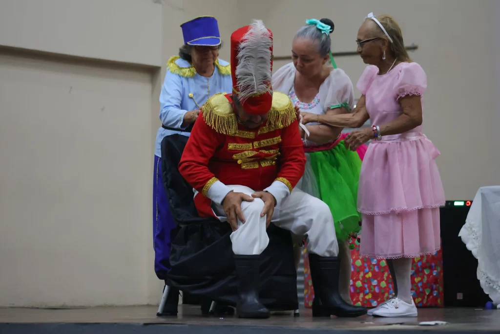 “O Quebra-Nozes: Uma Releitura” apresentou uma proposta inovadora que une adaptação teatral a elementos cênicos e coreográficos de diferentes linguagens da dança. Pela primeira vez na história do Projeto Idoso em Movimento, o espetáculo contou com uma coreografia de balé clássico, ampliando o acesso dos participantes a novas experiências artísticas.